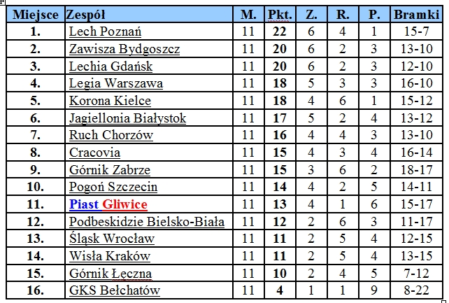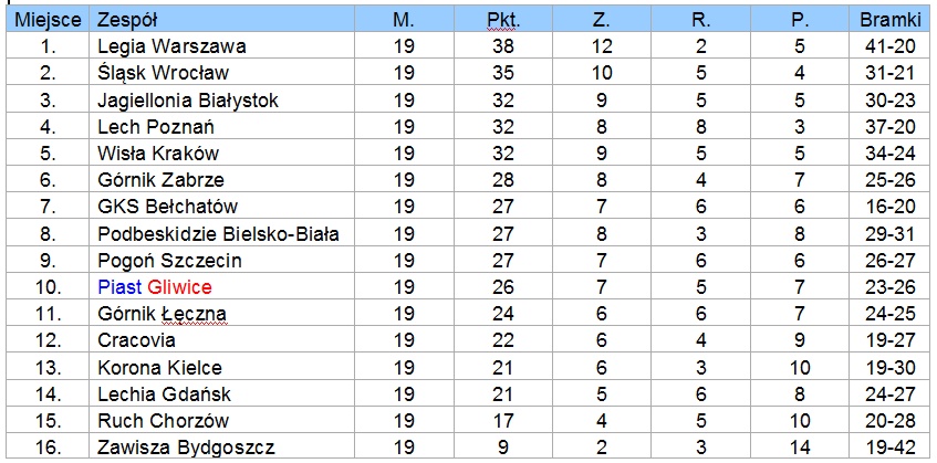 Tabela uwzględniająca wyniki tylko z rundy jesiennej