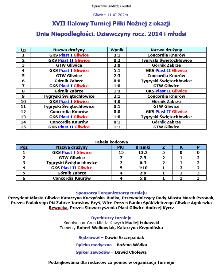 Do rywalizacji zgłosiło się pięć klubów. Stowarzyszenie GKS Piast wystawiło dwa zespoły. Pierwszy okazał się poza zasięgiem pozostałych drużyn. Podopieczne Katarzyny Krzyminskiej i Roberta Walkowiaka odniosły pięć zwycięstw, strzeliły 13 bramek, tracąc tylko 2. Nieprzypadkowo turniej ten rozgrywany jest 11 listopada. Ojciec chrzestny turnieju – Zygmunt Kajda chciał w ten sposób młodym adeptom piłkarskiego rzemiosła przypominać o tej ważnej dacie w historii Polski i to się udaje.